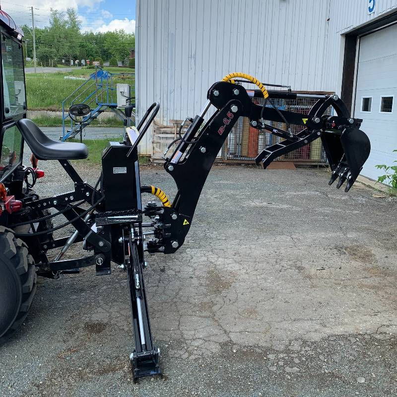 Le système de pivot de l'excavatrice est commandé par 2 cylindres hydrauliques, ce qui assure une rotation de 180 degrés permettant une bonne marge de manœuvre. L'attache 1 à 3 points de l'excavatrice Ex-Trac permet de l'installer facilement et rapidement lorsque vous en avez besoin. Les barres stabilisatrices offertes en option assurent une stabilité latérale et verticale. La manette de commande "joystick" est de qualité italienne, ce qui assure de la fluidité dans les déplacements du bras et le contrôle du godet. Les dents du godet sont de qualité industrielle et interchangeables. Nous utilisons un apprêt époxydique et de la peinture uréthane pour une meilleure résistance (couleur noire).
